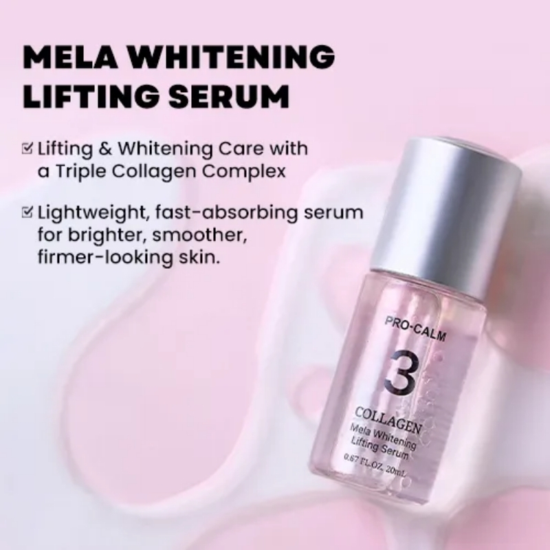 PRO-CALM Mela Whitening Lifting Serum 20ml is a lightweight multi-functional serum designed to brighten uneven skin tone, improve firmness, and calm sensitive-looking skin. With niacinamide, glutathione, ferments, collagen, and soothing botanical extracts, it helps reduce the look of dark spots and fine lines while leaving skin smoother, more radiant, and refreshed—an elegant daily treatment in any Korean cosmetics Cyprus routine.