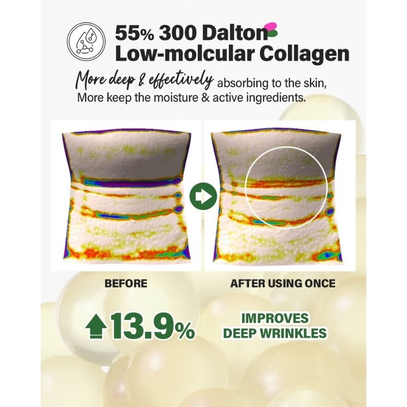 - Low-Molecular-Weight Collagen (53%): Deeply penetrates the skin to improve elasticity and reduce signs of aging.