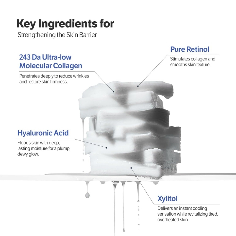 Water, Dipropylene Glycol, Glycereth-26, Glycerin, Betaine, 1,2-Hexanediol, Styrene/Acrylates Copolymer, Allantoin, Hydrolyzed Collagen, Xylitol, Hydroxyacetophenone, Ethylhexylglycerin, Caprylyl Glycol, Butyrospermum Parkii (Shea) Butter, C12-14 Alketh-12, Sodium Polyacrylate, Adenosine, Hydrogenated Lecithin, Polyglyceryl-10 Stearate, Centella Asiatica Extract, Lecithin, Polysorbate 20, Sodium Hyaluronate, Retinol, Hydroxypropyltrimonium Hyaluronate, Mentha Rotundifolia Leaf Extract, Camellia Sinensis Leaf Extract, Thymus Vulgaris (Thyme) Leaf Extract, Sodium Acetylated Hyaluronate, Hydrolyzed Hyaluronic Acid, Hyaluronic Acid, Madecassoside, Madecassic Acid, Asiaticoside, Asiatic Acid, Sodium Hyaluronate Crosspolymer, Hydrolyzed Sodium Hyaluronate, Potassium Hyaluronate