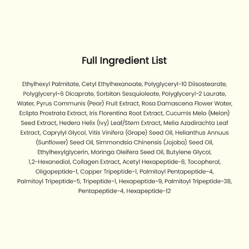 Ethylhexyl Palmitate, Cetyl Ethylhexanoate, Polyglyceryl-10 Diisostearate, Polyglyceryl-6 Dicaprate, Sorbitan Sesquioleate, Polyglyceryl-2 Laurate, Water, Pyrus Communis (Pear) Fruit Extract, Rosa Damascena Flower Water, Eclipta Prostrata Extract, Iris Florentina Root Extract, Cucumis Melo (Melon) Seed Extract, Hedera Helix (Ivy) Leaf/Stem Extract, Melia Azadirachta Leaf Extract, Caprylyl Glycol, Vitis Vinifera (Grape) Seed Oil, Helianthus Annuus (Sunflower) Seed Oil, Simmondsia Chinensis (Jojoba) Seed Oil, Ethylhexylglycerin, Moringa Oleifera Seed Oil, Butylene Glycol, 1,2-Hexanediol, Collagen Extract, Acetyl Hexapeptide-8, Tocopherol, Oligopeptide-1, Copper Tripeptide-1, Palmitoyl Pentapeptide-4, Palmitoyl Tripeptide-5, Tripeptide-1, Hexapeptide-9, Palmitoyl Tripeptide-38, Pentapeptide-4, Hexapeptide-12