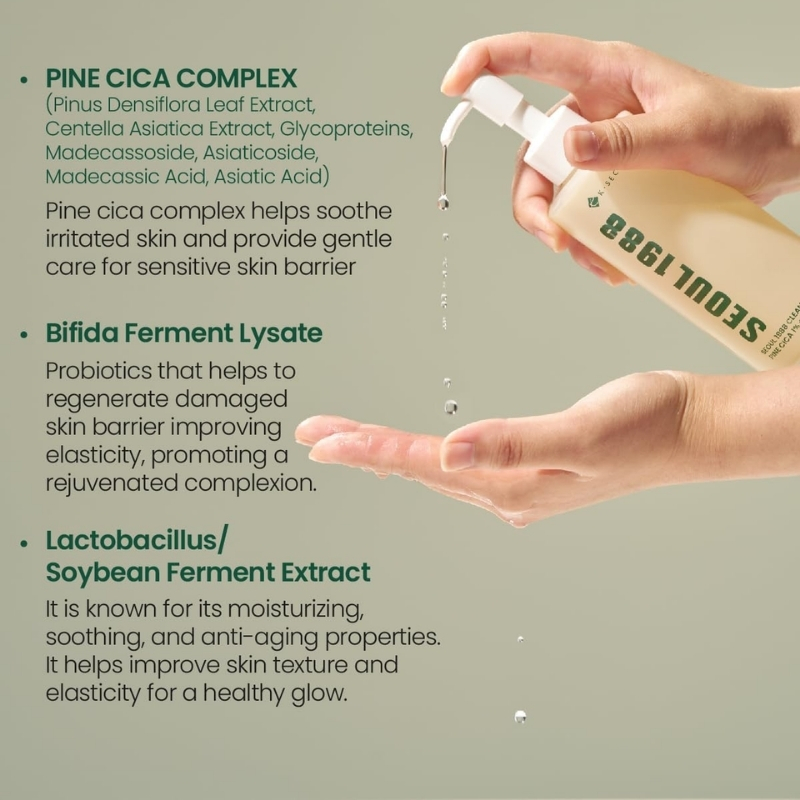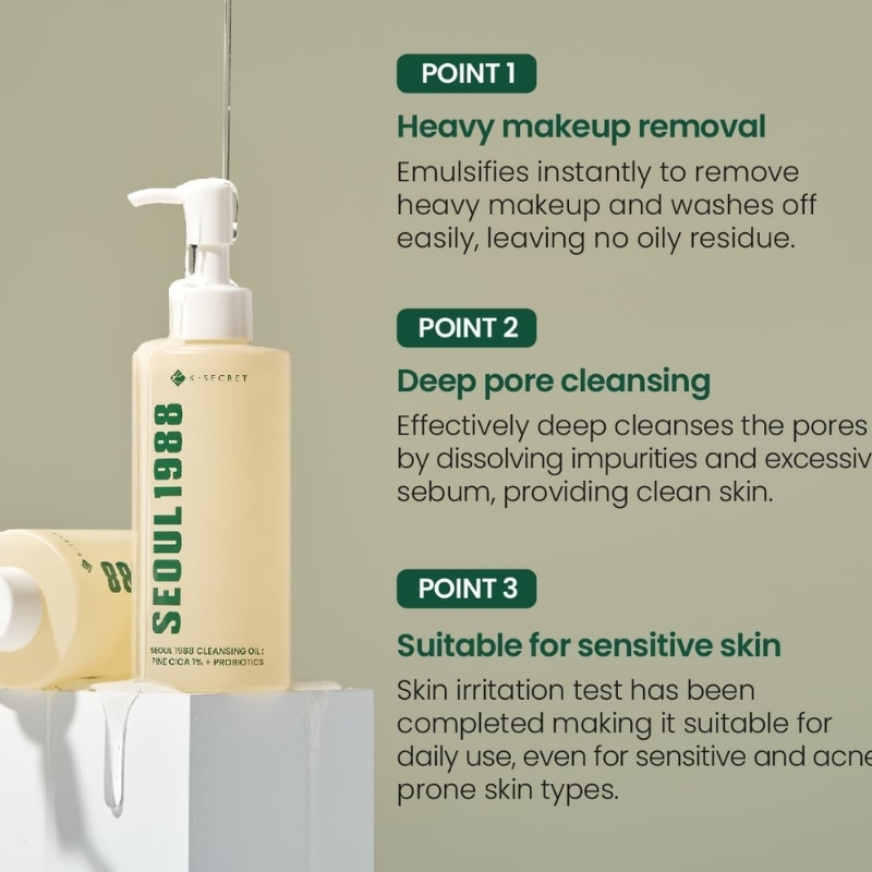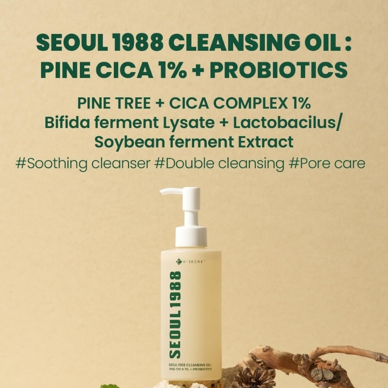 KSECRET SEOUL 1988 Cleansing Oil : Pine Cica 1% + Probiotics is a gentle yet thorough Korean oil cleanser for makeup that melts away sunscreen, base makeup, and daily impurities while keeping skin feeling fresh and comfortable. Infused with Pine Cica Complex and probiotics, this Korean Cosmetics cleansing oil helps clear pore buildup (blackheads/whiteheads and excess sebum) without clogging pores—ideal for KBEAUTY Cyprus routines, including sensitive and acne-prone skin.