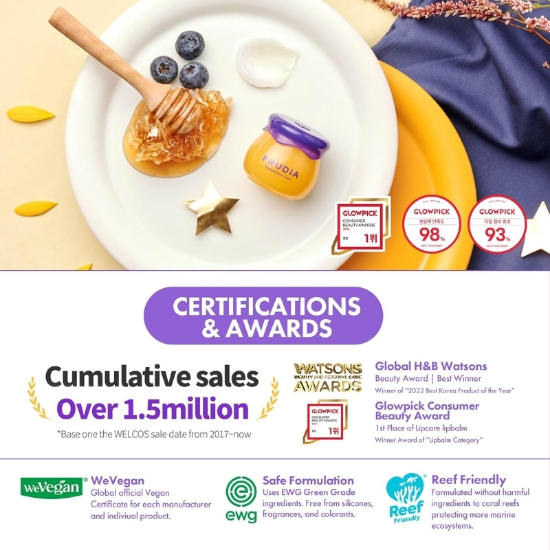 FRUDIA Blueberry Honey Lip Balm is a jam-textured Korean lip treatment that blankets parched lips in long-lasting moisture while gently buffing away flakes. Powered by vitamin-rich Jeju Blueberry and raw Honey, the cushiony balm melts on contact to smooth, plump and protect, leaving a glossy “honey-juice” finish and a mouth-watering sweet-tart blueberry scent.