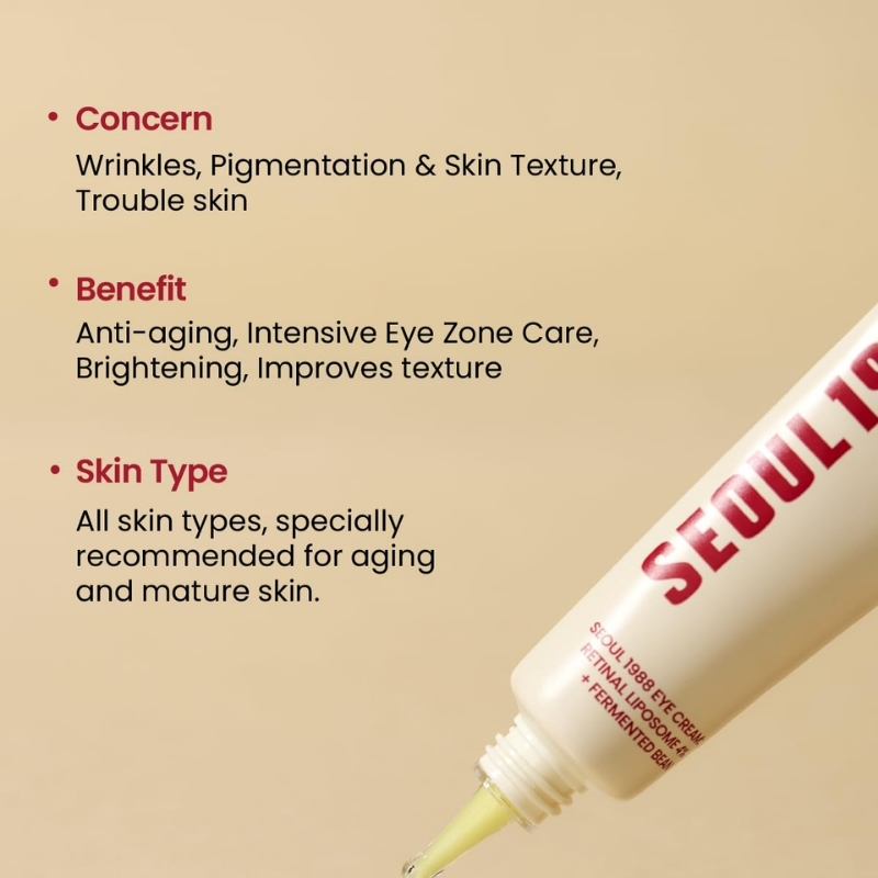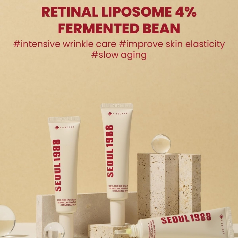 K‑Secret SEOUL 1988 Eye Cream : Retinal Liposome 4 % + Fermented Bean is a multi‑tasking, low‑irritation eye treatment that slips 0.04 % pure retinal (encapsulated at 4 % liposome strength) deep into delicate skin to smooth fine lines, fade dark‑spot pigmentation and boost collagen bounce. Fermented soybean extract, bakuchiol, 3‑O‑ethyl vitamin C, vitamin E and a trio of youth peptides team up with five herbal root ferments for a brighter, firmer, glass‑skin eye zone without the sting traditional retinoids can bring.