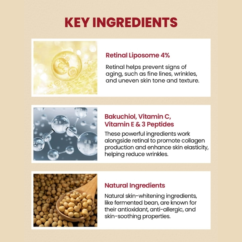 Water, Glycerin, Dipropylene Glycol, Caprylic/Capric Triglyceride, 1,2‑Hexanediol, Butylene Glycol Dicaprylate/Dicaprate, Niacinamide, Pentaerythrityl Tetraethylhexanoate, Cetearyl Alcohol, Butylene Glycol, Cetearyl Olivate, Sorbitan Olivate, Hydrogenated Lecithin, Macadamia Ternifolia Seed Oil, Carbomer, Tromethamine, Propanediol, Glyceryl Stearate, Cholesterol, Polyglyceryl‑10 Oleate, Ethylhexylglycerin, Adenosine, Brassica Campestris (Rapeseed) Sterols, Phytosteryl/Behenyl/Octyldodecyl Lauroyl Glutamate, Retinal, Silica, Disodium EDTA, Aluminum/Magnesium Hydroxide Stearate, Lactobacillus/Panax Ginseng Root Ferment Filtrate, Lactobacillus/Rice Ferment, Lactobacillus/Soybean Ferment Extract, Saccharomyces/Coix Lacryma‑Jobi Ma‑yuen Seed Ferment Filtrate, Saccharomyces/Potato Extract Ferment Filtrate, Tocopherol, Potassium Cetyl Phosphate, Pentaerythrityl Tetra‑di‑t‑Butyl Hydroxyhydrocinnamate, Sodium Hyaluronate, Arctium Lappa Root Extract, Cnidium Officinale Root Extract, Dioscorea Japonica Root Extract, Paeonia Suffruticosa Root Extract, Rehmannia Chinensis Root Extract, 3‑O‑Ethyl Ascorbic Acid, Bakuchiol, sh‑Oligopeptide‑1, sh‑Oligopeptide‑2, sh‑Polypeptide‑1