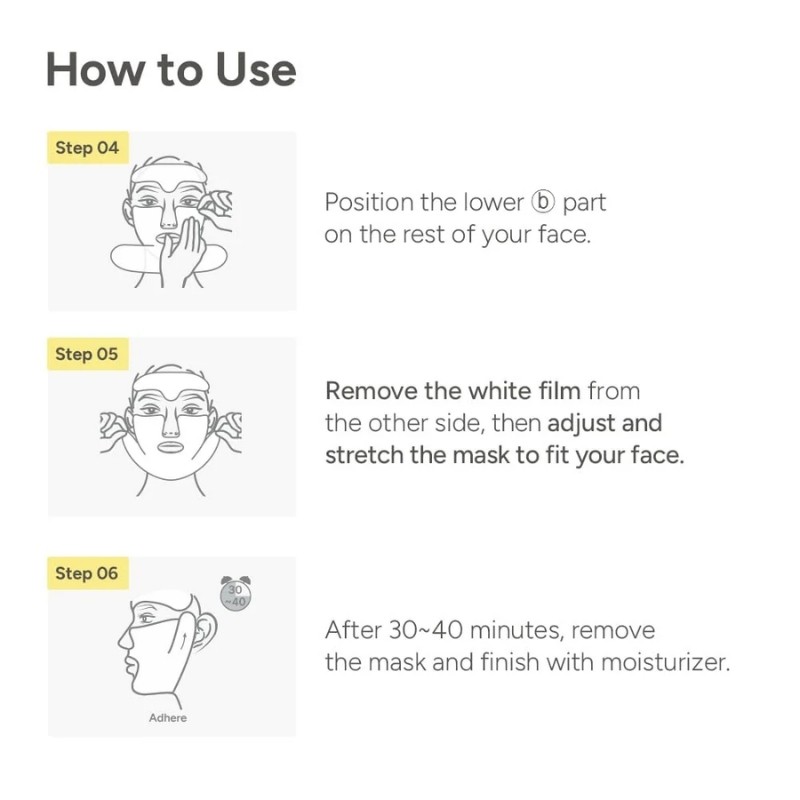 - After cleansing and toning, apply the two mask pieces to avoid eyes and lips, aligning to jawline/smile lines/forehead.