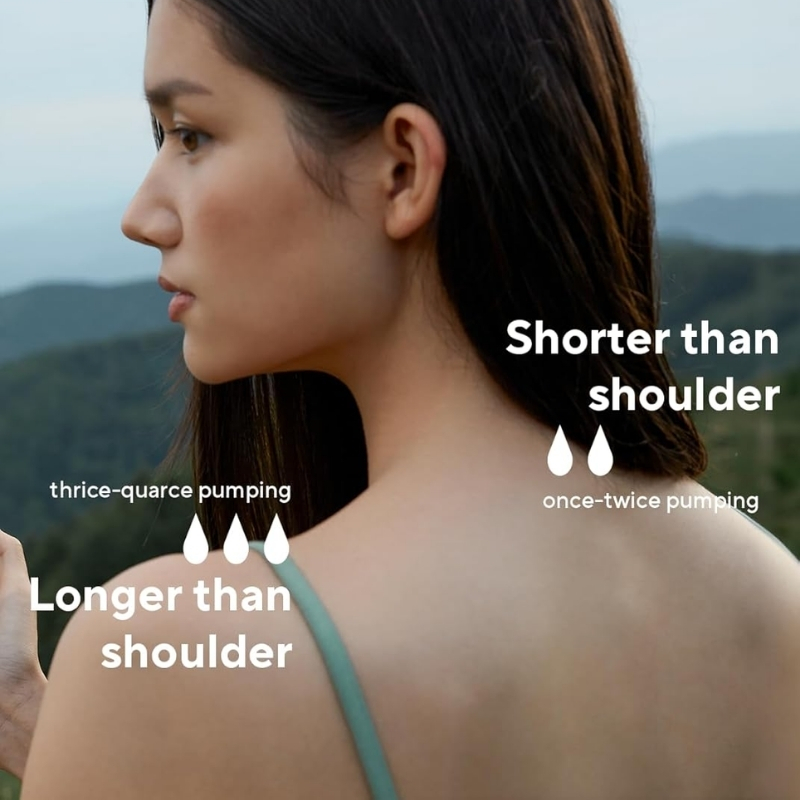- Towel-dry hair. Pump 1–2× above-shoulder or 2–4× below-shoulder lengths into palms.