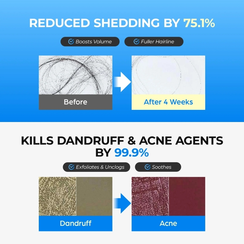 - Brand-reported testing: up to 75.1% less shedding; up to 99% reduction of dandruff/acne fungus indicators. Brand data; results vary.