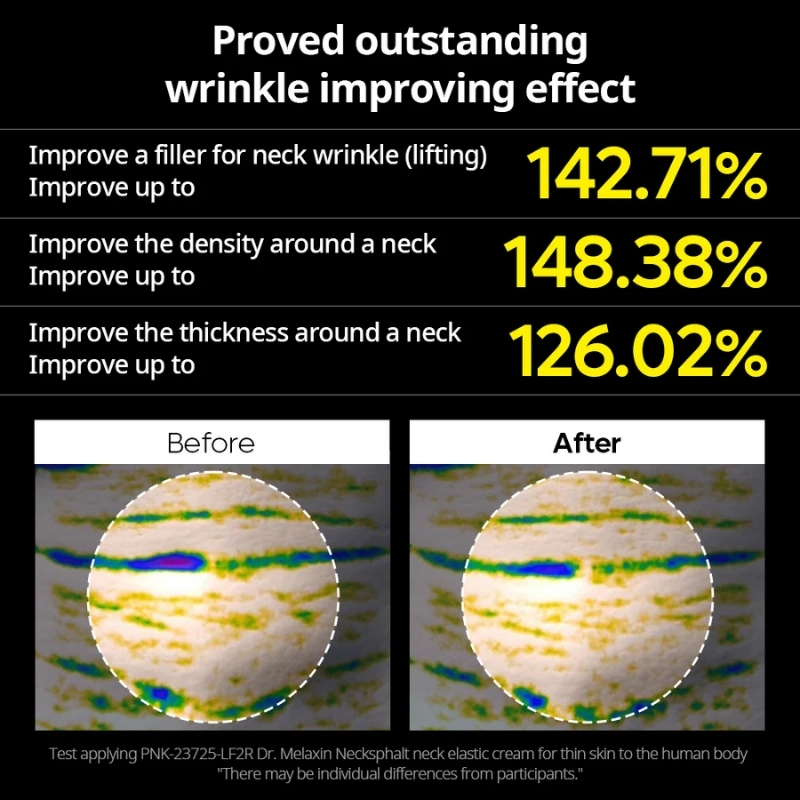 - Neck skin thickness improved by up to 126.02% in the tested group (results may vary by individual).