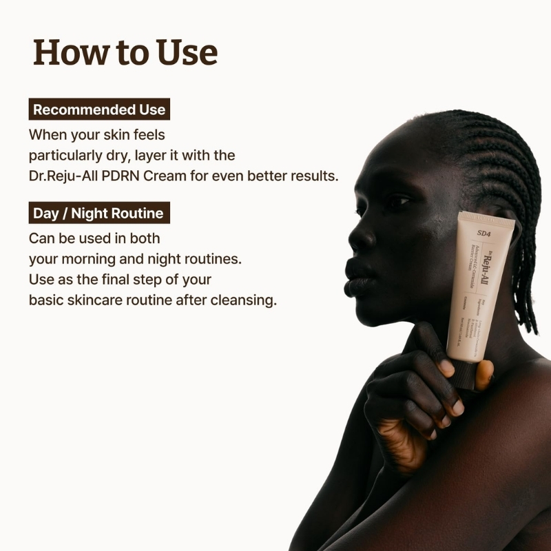- Use morning and night daily. When skin feels particularly dry, layer with Dr. Reju-All Advanced PDRN Rejuvenating Cream for enhanced hydration. In the morning, finish with sunscreen.