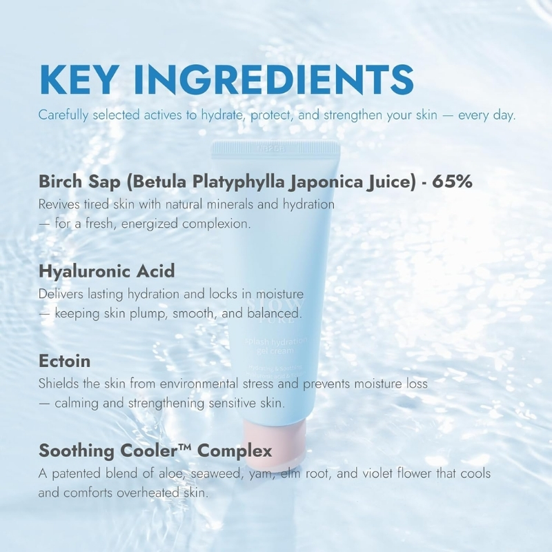 - Weightless gel-cream: water-gel texture bursts on contact, absorbs fast, and dries non-sticky—great under SPF and makeup.