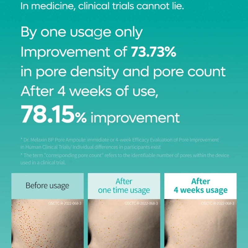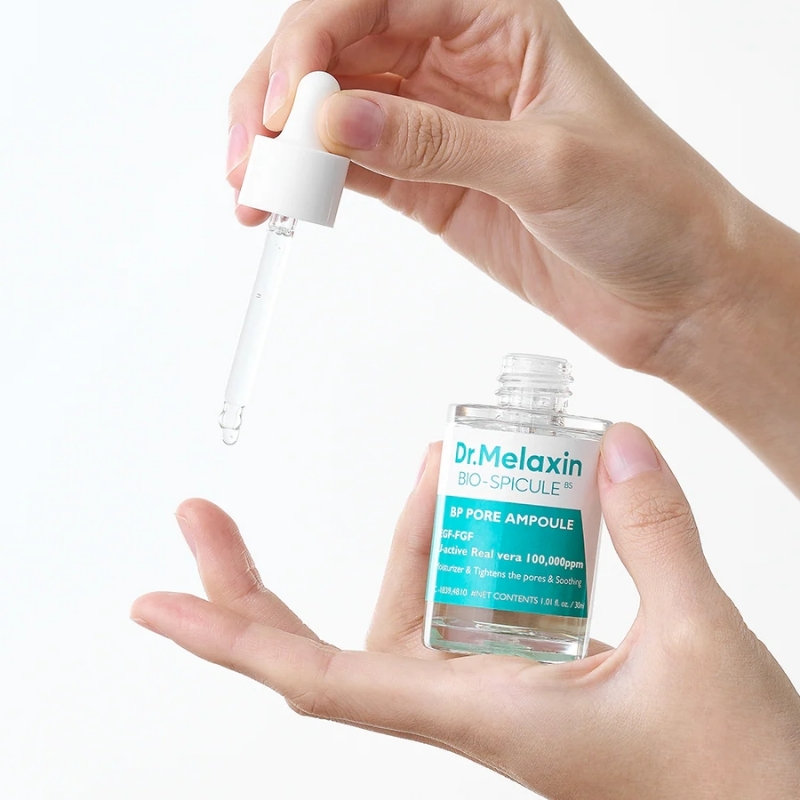 - After cleansing and toning, dispense a small amount of Dr.Melaxin BP Pore Ampoule with the dropper onto clean fingertips or directly onto areas with visible pores.