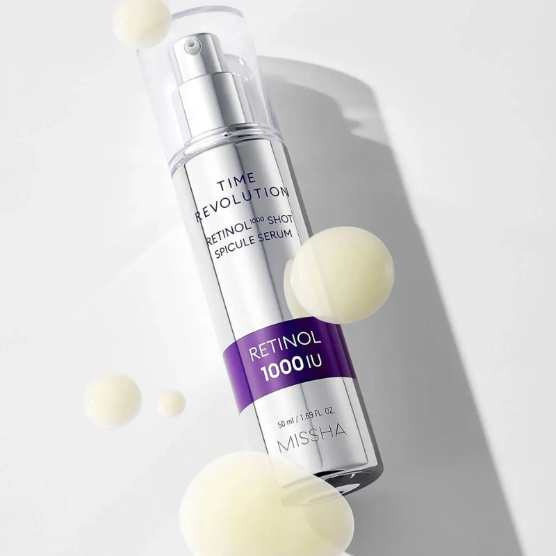 MISSHA Time Revolution Retinol 1000 Shot Spicule Serum (50 ml) is an intensive, firming & pore-tightening retinol serum that uses 99% ultra-refined spicules to deliver actives fast—helping smooth lines, shrink the look of enlarged/vertical pores, and boost elasticity with comfortable hydration. A cushiony base with hyaluronic acid, panthenol, beta-glucan and ceramide NP supports a stronger barrier, while Extreme Biome™ (10 fermented ingredients) nourishes and revives dull, tired skin.