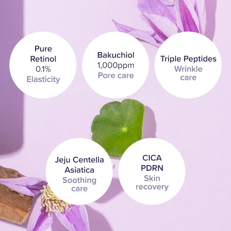 - Retinol (0.1%): Stimulates collagen production, aids in cell turnover, and improves skin texture and tone.