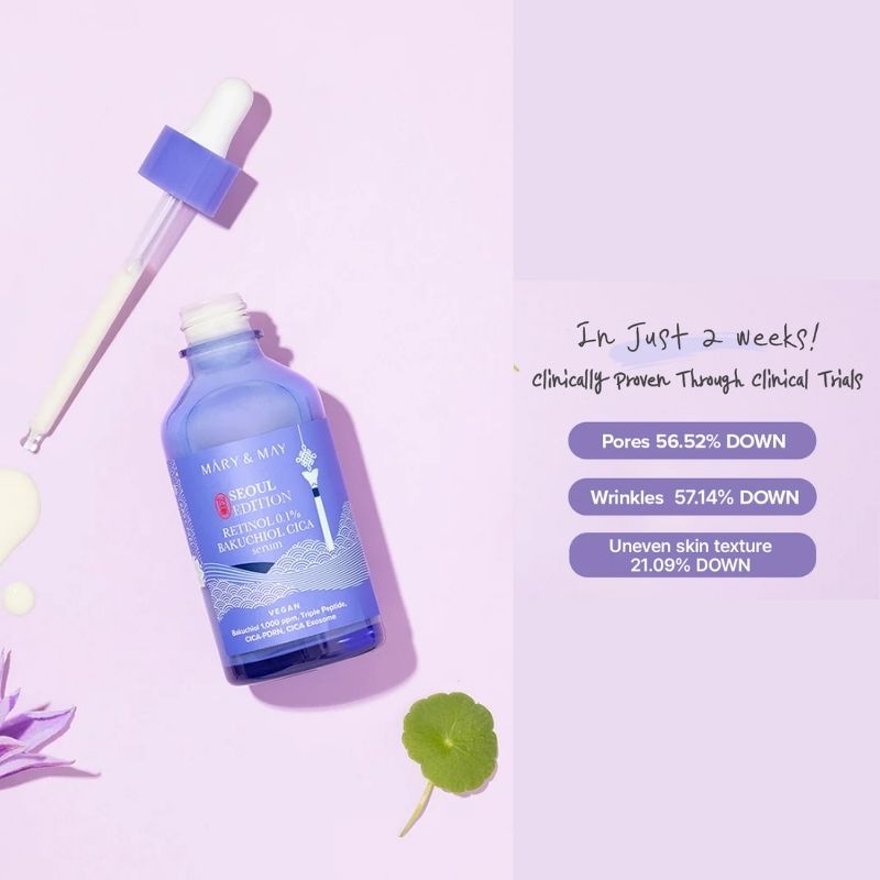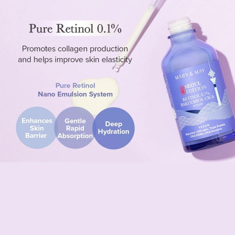 Mary&May Seoul Edition Retinol 0.1% Bakuchiol Cica Serum combines innovative K-beauty technology with potent ingredients for anti-aging and skin elasticity enhancement. This vegan, cruelty-free serum is designed to improve skin texture, reduce wrinkles, and enhance pore elasticity without causing irritation, making it perfect for daily use.