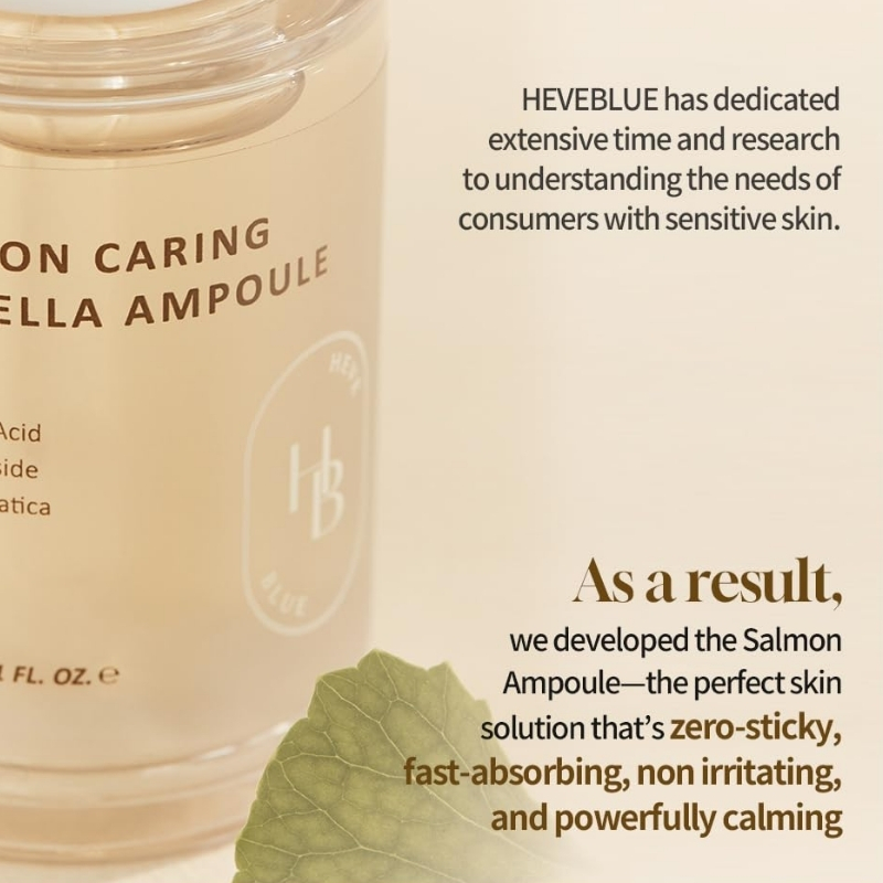 Meet the Heveblue Salmon Caring Centella Ampoule—a potent formula brimming with high-quality active ingredients. Instead of using purified water, it boasts a concentrated blend of Centella Leaf Water (847,474 ppm), Salmon Roe Extract (1,500 ppm), and PDRN (10,000 ppm) to calm irritation, rejuvenate damaged skin, and support a healthy, balanced complexion. Clinically tested for low irritation (index 0.00) by the Korea Institute of Dermatological Sciences, this ampoule also contains the patented avocado peptide EFFPUIP and madecassoside, ensuring both soothing and protective benefits for even the most sensitive skin.