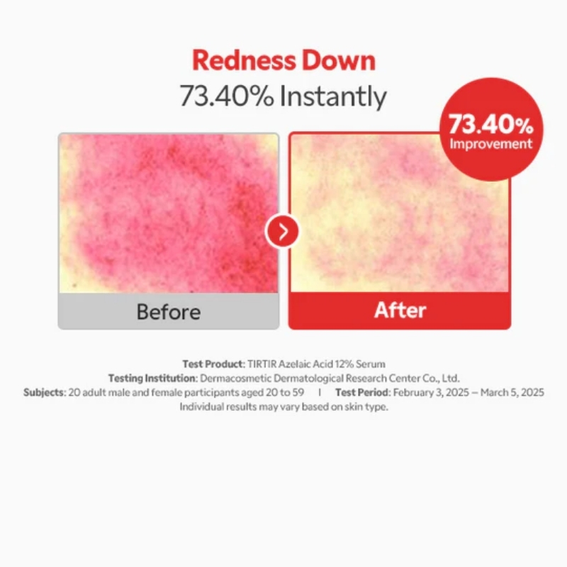 - After cleansing and toner, apply a small amount of TirTir Azelaic Acid 12% Serum to the entire face or directly onto areas with breakouts, redness or uneven tone, avoiding the eye and lip area.