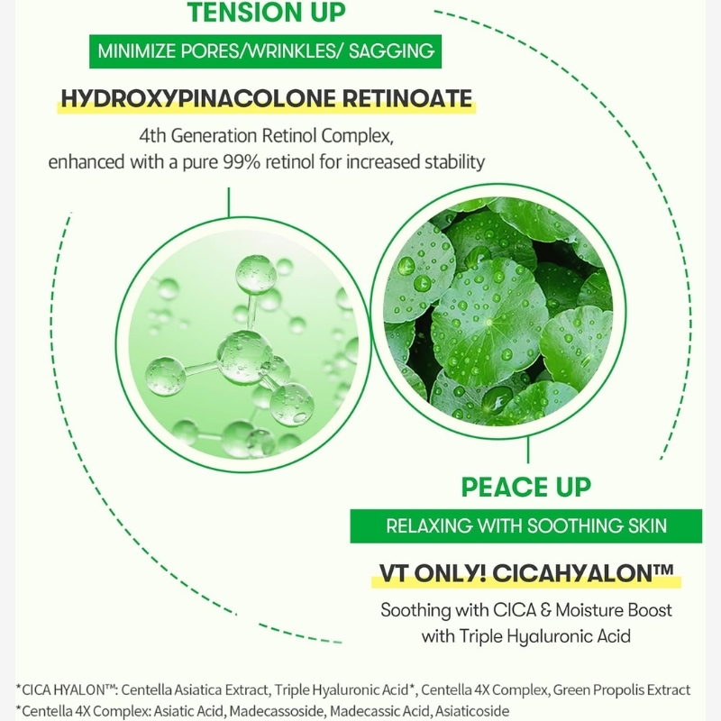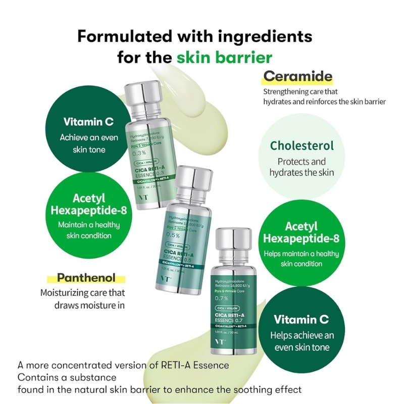 VT Cosmetics Cica Reti‑A Essence 0.3 is a lightweight pore‑tightening, wrinkle‑smoothing essence that pairs 0.3 % Hydroxypinacolone Retinoate (99 % pure retinol) with VT’s signature CICAHYALON™ to refine texture, firm sagging skin and deliver soothing hydration in one step.