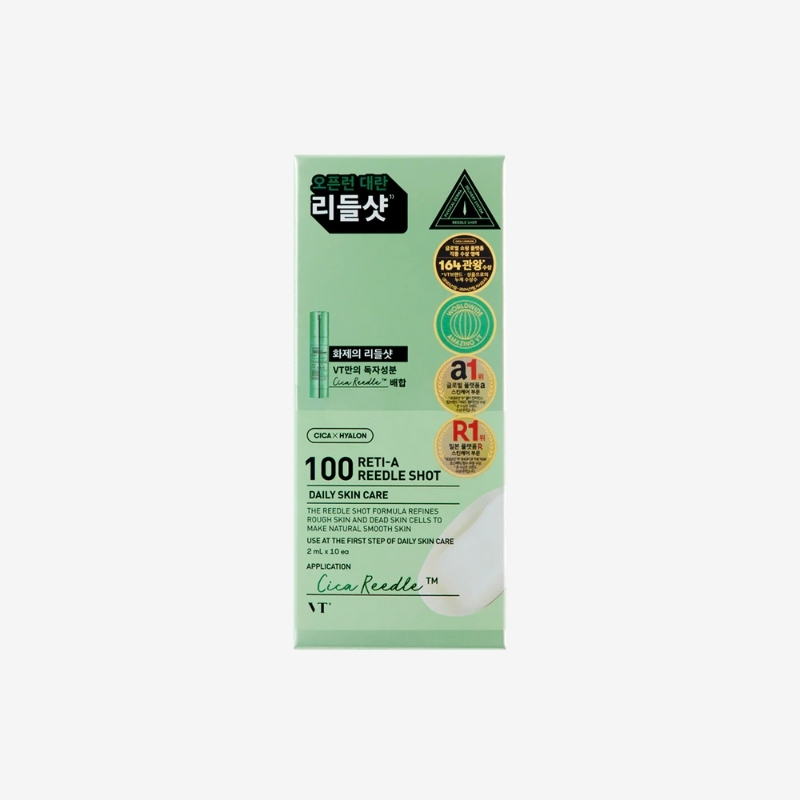 VT Cosmetics Reti-A Reedle Shot 100 is VT’s beginner-friendly “micro-needling” emulsion that pairs CICA REEDLE™ spicule technology with stable Reti-A (Vitamin A Complex + Bakuchiol) to resurface rough texture, refine enlarged pores and reveal glass-smooth, hydrated skin in a single overnight step.