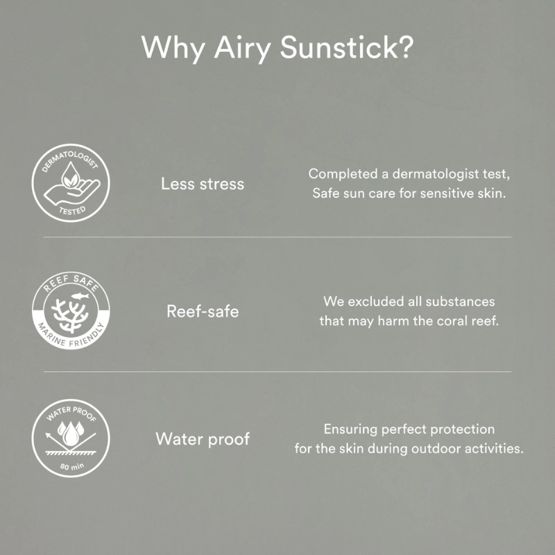 Ultra lightweight sunstick without any sticky feeling. Does not cakey even after several reapplications. Does not clump even when applied on top of makeup. Water Resistant for 80 minutes.