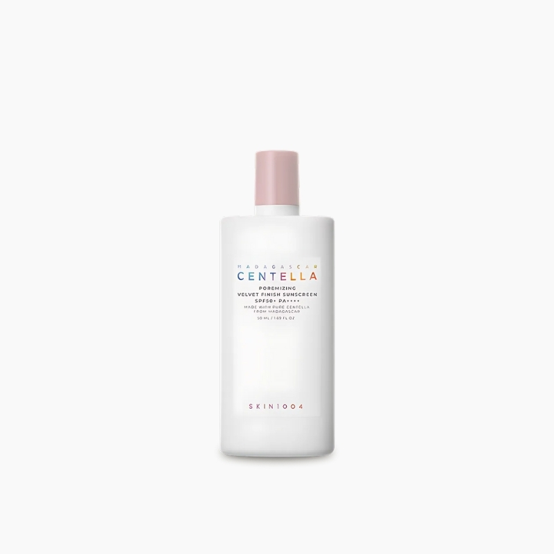 SKIN1004 Madagascar Centella Poremizing Velvet Finish Sunscreen SPF 50+ PA++++ (50 ml) is a weightless, beige-tinted sun shield that blurs pores and evens tone while Centella and aloe keep stressed skin calm and comfortable. The soft-matte “velvet” texture grips make-up, controls shine and leaves zero white cast.